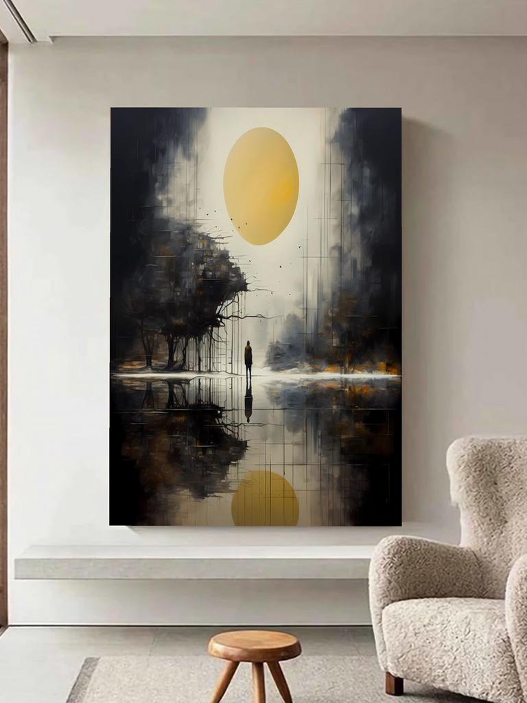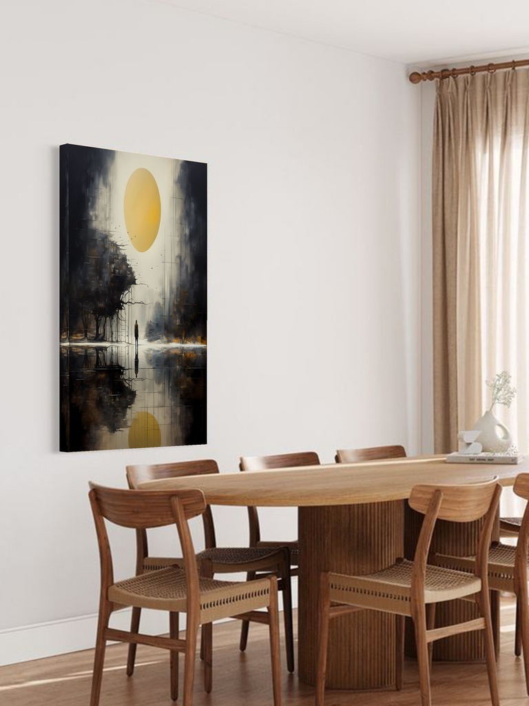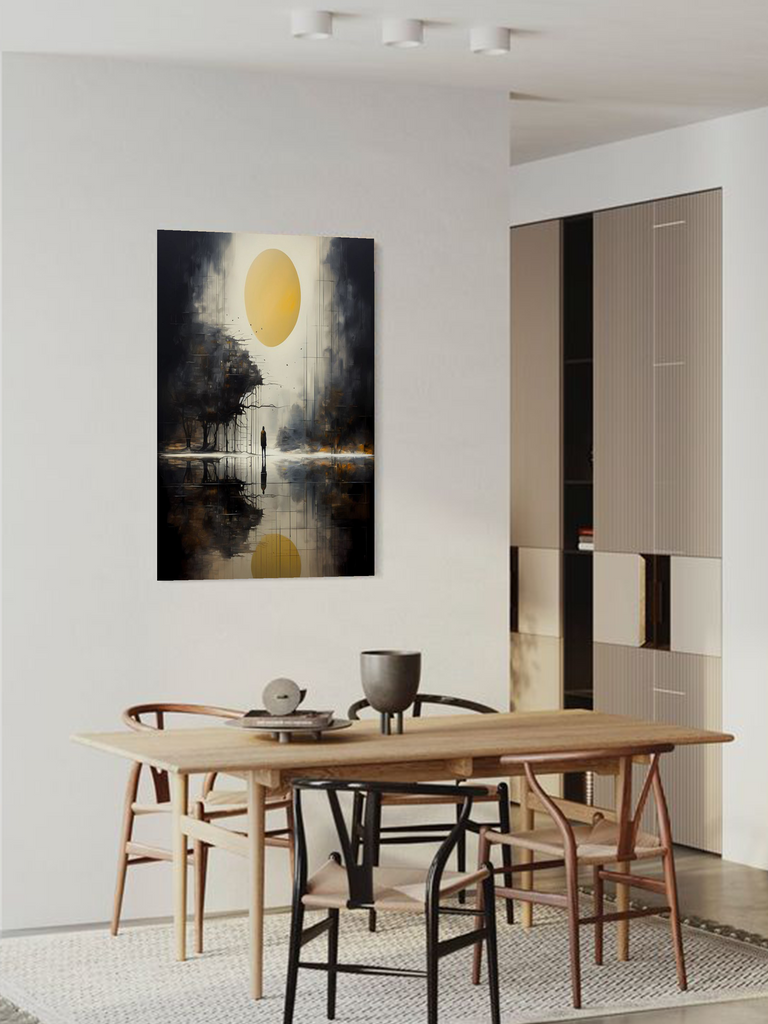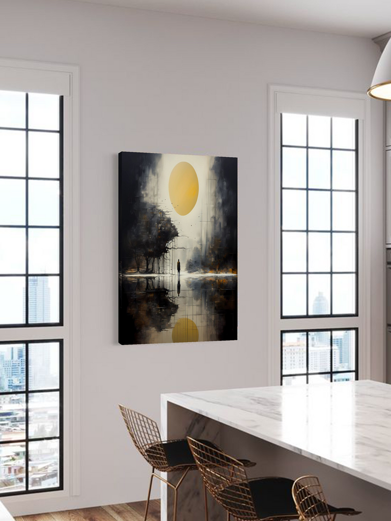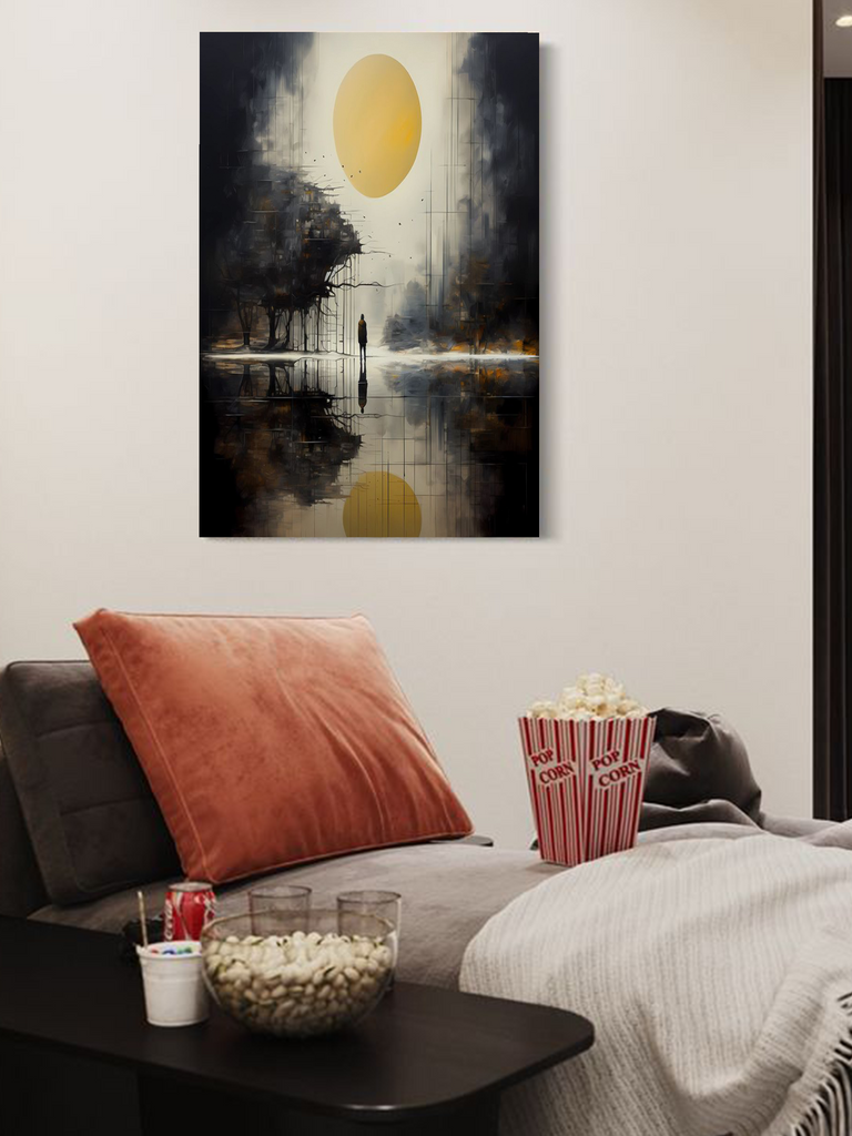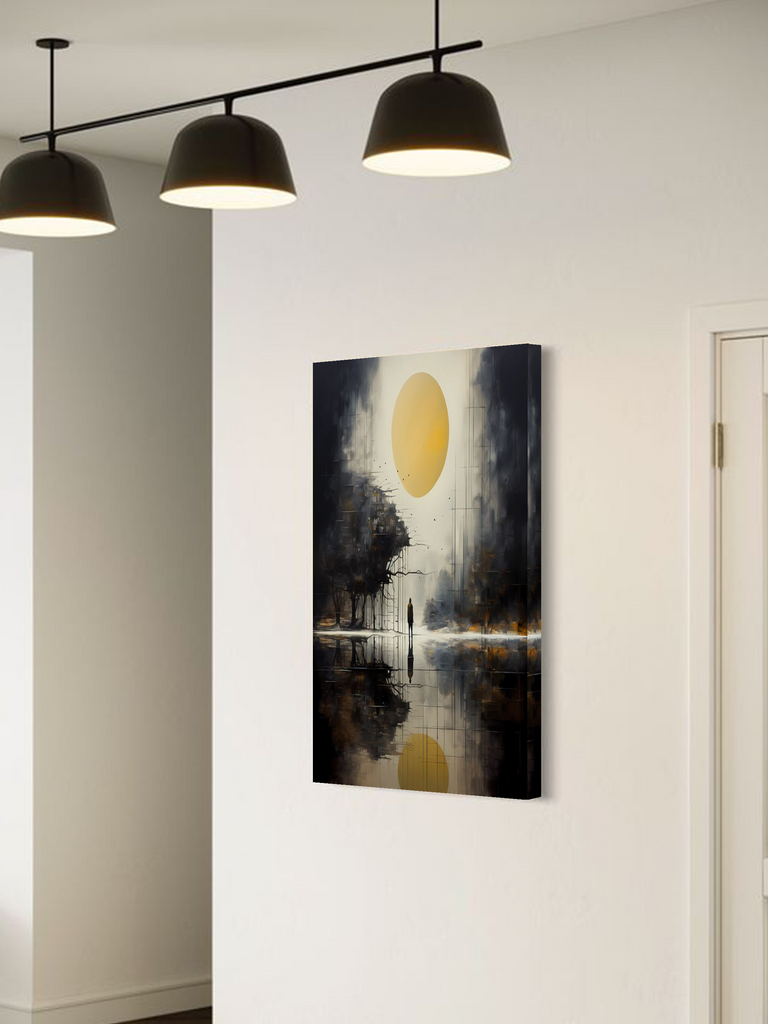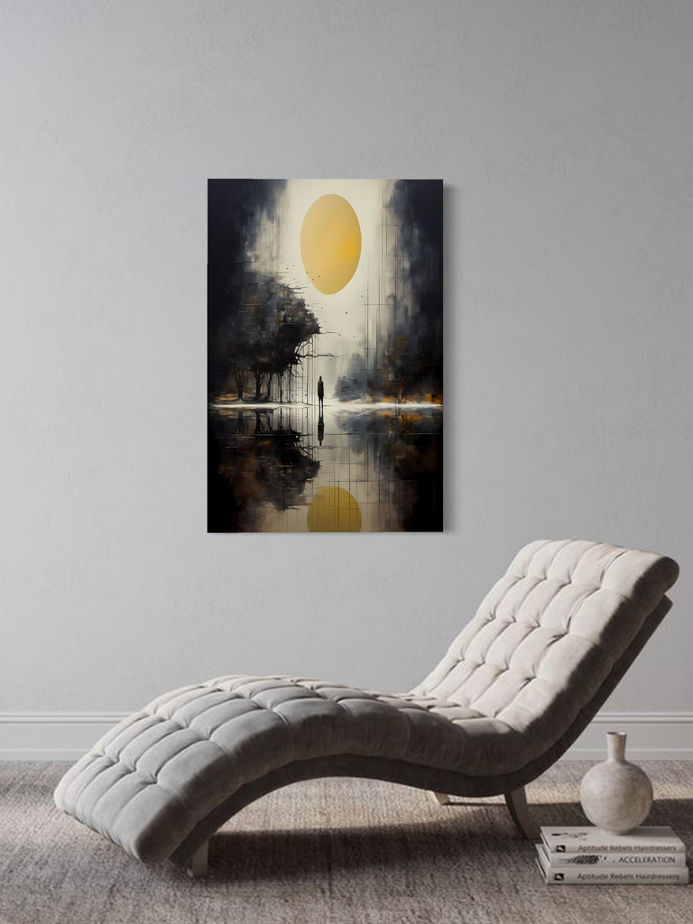 In “Ecliptic Silence,” a solitary figure stands at the edge of mirrored waters beneath a colossal, golden sun. The scene is divided by shadow and light, with smoky forests on either side dissolving into abstract geometry. The reflection blurs the boundary between sky and earth, evoking themes of isolation, introspection, and the infinite. Stillness reigns here, and yet the air hums with the silent gravity of a moment suspended between past and future.